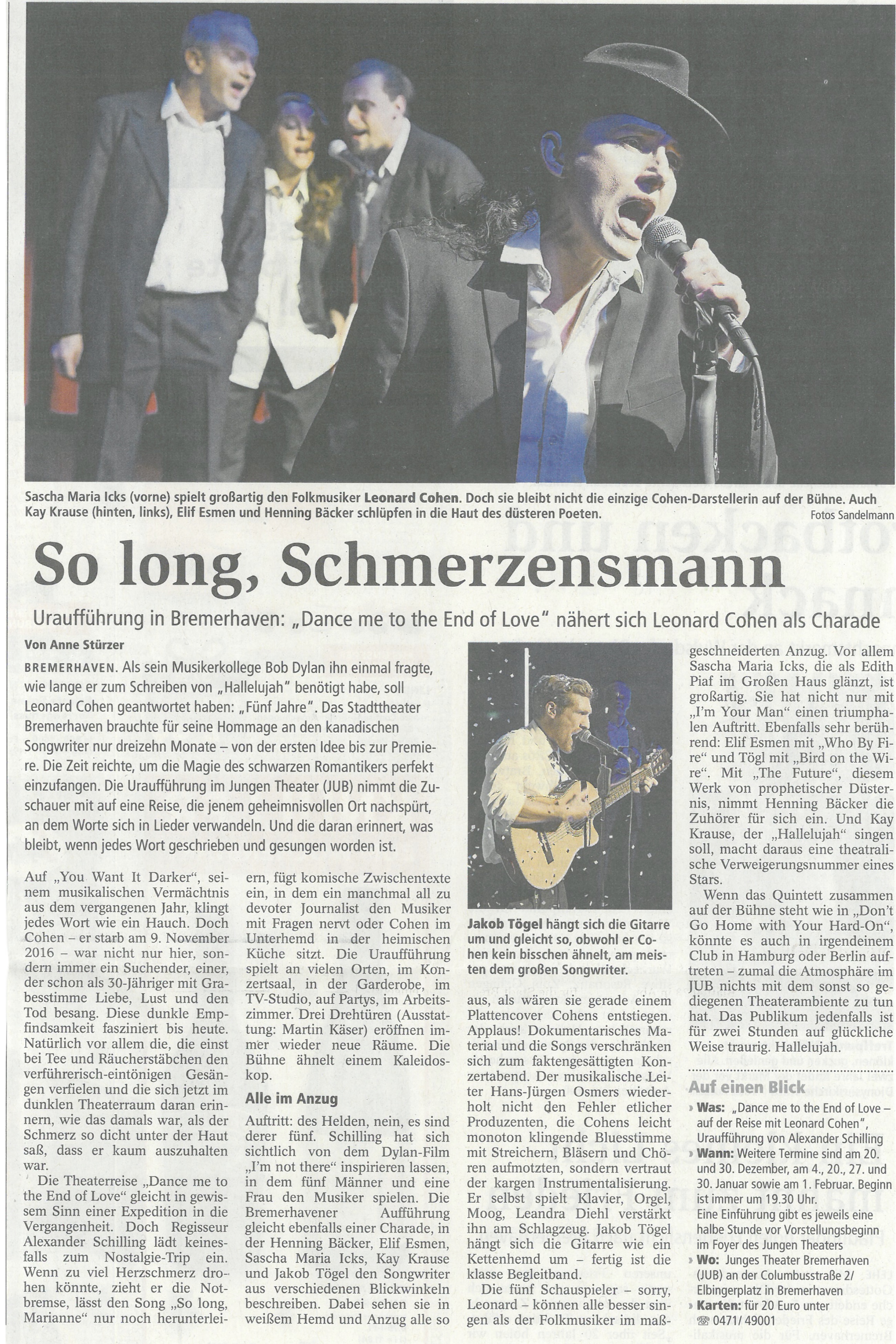 "Die Uraufführung […] nimmt die Zuschauer mit auf eine Reise, die jenem geheimnisvollen Ort nachspürt, an dem Worte sich in Lieder verwandeln. […] Wenn das Quintett zusammen auf der Bühne steht […] könnte es auch in irgendeinem Club in Hamburg oder Berlin auftreten […] Das Publikum jedenfalls ist für zwei Stunden auf glückliche Weise traurig. Hallelujah."