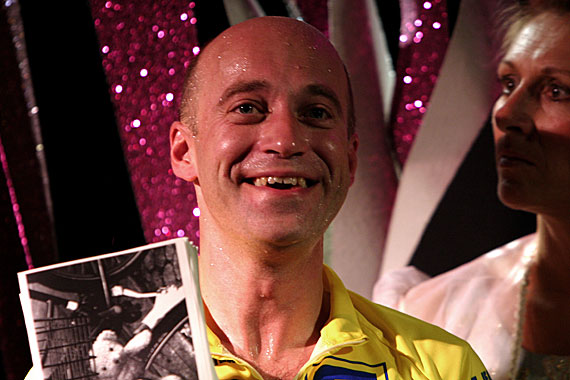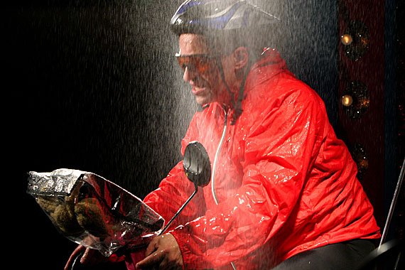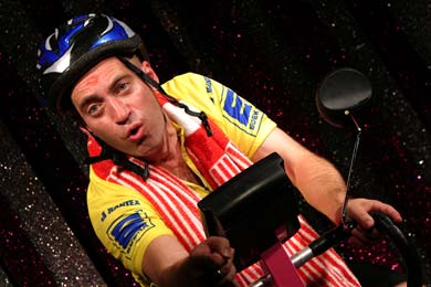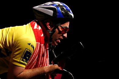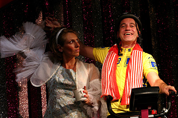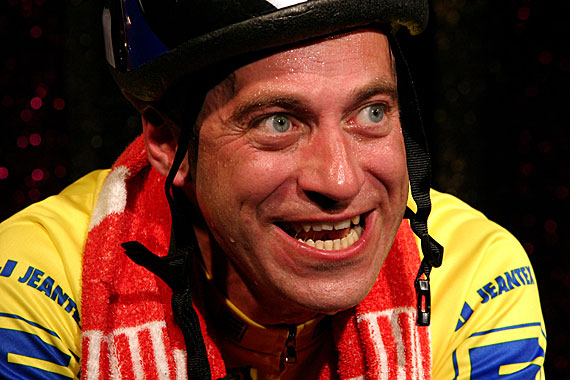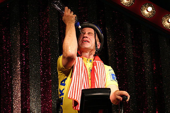 Weil Neuber, wie er hier erneut zeigt, tragisch im Solo ist. Aber nur so tragisch, dass alles auch komisch bleibt. Bis zum makabren Schluss, den Regisseur Alexander Schilling in seiner detailreichen Inszenierung gut umsetzt. Lewandowskis kuriose Idee, das Radrennen als Befindlichkeitsmetapher auszugestalten, trägt das Stück. Das Leben, eine Leidenstour. Der Kapitalismus, ein Wettrennen, ein Traum von der Sieger-Einfahrt ins glänzende Paris. Dass diese Binsenweisheit ironisch und weder platt noch pseudo-philosophisch vorgeführt wird, ist auch Bühnenbildner Stephan Rinke zu verdanken: Er stellt Henrys Heimtrainer auf eine übertrieben glitzernde Variété-Bühne.