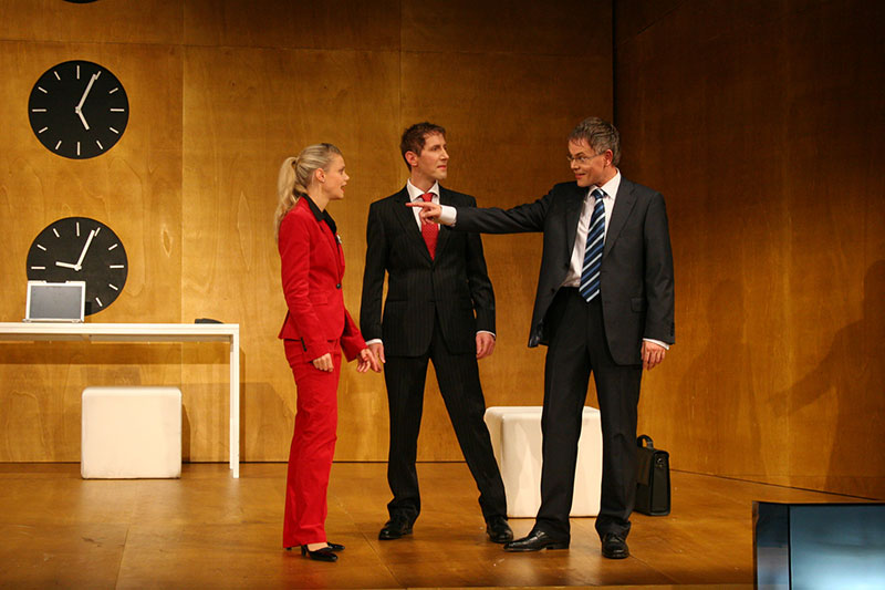 Alexander Schilling hebt das Tragische des vermeintlich heiter-leichten Plots in seiner Inszenierung klar hervor. Susanne Pische unterstützt dies durch eine zurückgenommene Ausstattung, die in ihrer Super-Size-Auslegung die gigantische Leere, das Unpersönliche internationaler Grossunternehmen spürbar macht. Ein hallenartiges, spärlich möbliertes Büro, hinter dessen streng gesicherten Türen die Untergang der Welt mit Gourmethäppchen und Champagner besiegelt wird.