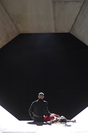 Woyzeck will nicht sehen, dass nicht nur seine Welt, sondern auch sein Privatleben nicht in Ordnung ist. Wenn er vorne an der Rampe sitzt und in seinem falschen Zweckoptimismus davon träumt, dass alles gut ist, zieht sich hinten Marie (Carolin M. Wirth), seine Geliebte und Mutter seines Kindes, für den virilen Tambourmajor (Marek Sarnowski) aus; Woyzeck gibt sich - „All the world is green" - schnulzigen Phantasien hin, Marie dem Tambour. Als ihm ihr Fehltritt hinterbracht wird, knallt Woyzeck durch und bringt Marie um.