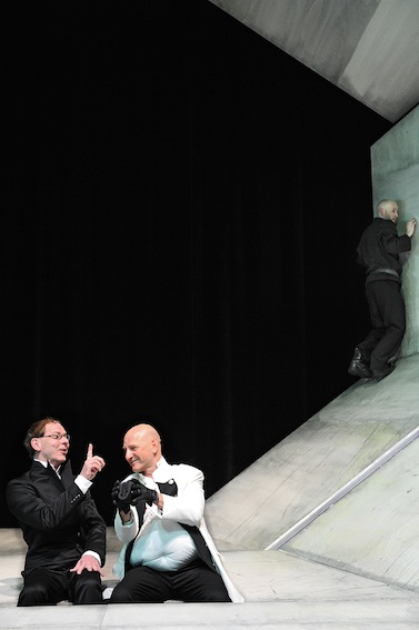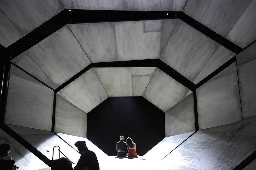 Das Bühnenbild von Manfred Kaderk ist ein wabenförmiger grauer Tunnel ins Nichts, der im Laufe des Abends immer länger wird. Grelles Neonlicht im Zuschauerraum verstärkt den Eindruck einer ausweglosen Labor-Situation. Auf den schrägen Ebenen des Tunnels rutschen die Darsteller immer wieder ab.
